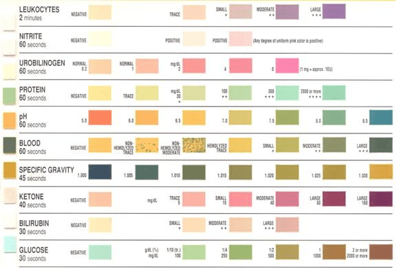 Urinalysis color chart with information on how to interpret the color variations on home urine test strips, including what the color changes . Urinalysis test strip color chart. Urine rapid teststrips reactif 11 parameter with colour scale. The chemical test for glucose is the benedict's solution test. Further, it is important for a nurse to note changes in urine color from previous observations or from the previous docume.